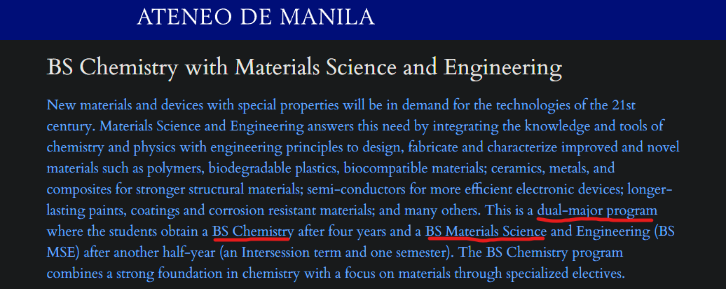 - This is a dual-major program, Chemistry being the first and Material Science and Engineering as the second.